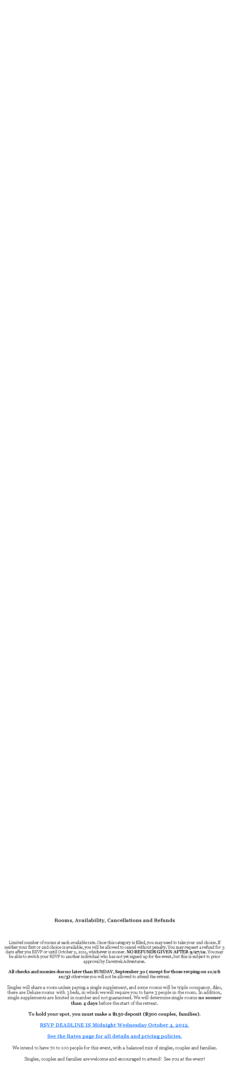 EVENT LINKS ¨ RSVP Form FAQ - All the questions, many of the answers... ¨ HOW MUCH DOES IT COST? - Rates, Deposits & Payment Deadlines ¨ ROOMS —3 types/levels, with some room pictures ¨ ACTIVITIES & EVENTS ( Onsite & Offsite) PayPal Page - For Deposits ¨ TRANSPORTATION (Rides, Buses, Trains, etc) & Directions to the Event ¨ Pictures from the 2008 Retreat ¨ DIFFERENCES FROM OTHER DAVETREK WEEKENDS |