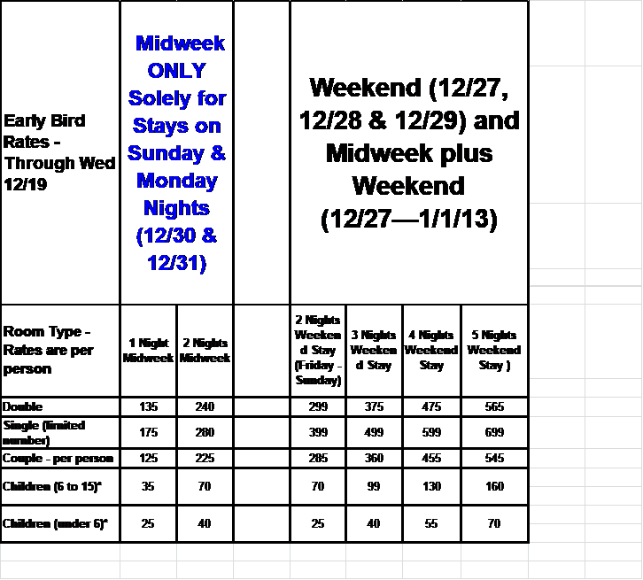 DETAILS OF THE WEEKEND I am pleased to announce our 6th New Years Weekend at the Shaker Mill, located 2.5 hours from Manhattan and 3 hours from Boston & Brooklyn. We will be going to my favorite place, the Inn at Shaker Mill in New Lebanon, NY, 15 minutes from Pittsfield MA, in the heart of the Berkshires. We have been going to the Shaker Mill for over a decade as its peaceful and relaxing. You may register for as little as 1 midweek night or as many as 5 nights. As Shabbat will likely sell out, preference for Shabbat will be given to those staying at least 3 nights, so keep this in mind when registering. Please RSVP quickly, as this will sell out. SIGN UP - Complete the RSVP form here, and sending in your deposit (see Costs, below). PLEASE MAKE SURE TO ANSWER ALL RELEVANT QUESTIONS ON THE RSVP FORM. THIS HELPS MAKE THE WEEKENDS BETTER AND SIMPLER TO RUN. DATES OF THE EVENT The dates we intend to be at the Shaker Mill are THURSDAY NIGHT, DECEMBER 27 —TUESDAY, JANUARY 1, 2013. You may stay for as little as 1 night or as many as 5 nights. All are welcome, couples, singles and families. Kosher Food & Catering We intend to offer kosher food, snacks and meals starting as of Thursday Night, December 27 and running until Tuesday, January 1, 2013. We are having a free lance kosher caterer, Victoria Sutton, who will cook and help run the meals, with all of your help as well ( see below, ‘Helping on the Weekends’ for details). Please see the sample menu from our weekend this past summer for further details. Activities ACTIVITIES In the Winter, there are weather dependent winter sports in the area such as Downhill & Cross Country Skiing (Jiminy Peak is nearby), snow boarding, snow tubing, snowmobiling (expensive), hiking, museums & other events for those not into outdoor activities. The Berkshires weather forecast starting as of this weekend is for lows in the 20s and teens and highs into the 30s, perfect weather for making snow for all the winter sports. In all seasons, we will also have movies at night, and maybe some karaoke! Let me know your interests & movie picks on the RSVP form. To see some of the events and activities on offer, go to Berkshires Activities page I have set up– this so far has general attractions in the area and events from previous years but we will soon update it with the new events. There will be a Bach at New Years concert on New Years Eve, as well as Jiminy Peak Skiing, Butternut Snowtubing and more! There are wonderful museums such as a Norman Rockwell (everyone loves this one), MASS MOCA, a contemporary art museum, and the Clarke, one of the best regional art museums in the US, which is FREE in the winter! We will organize people to go on hikes, museums, biking, and various winter activities. Let us know your preferences on the RSVP form. DESCRIPTION OF THE SHAKER MILL & PICTURES The Mill is large, comfortable and cozy, on 4 floors with 17 bedrooms (4 to 6 single rooms, 10 to 12 doubles, and a few triples). Each bedroom has its own bathroom, and most rooms have double beds. Some folks will also be in two rooms in an adjoining building. The exact room configurations will depend on how many people we get… PICTURES OF THE SHAKER MILL SHAKER MILL’s Facebook Page The Mill has a dining room for 45, a huge kitchen, a beautiful large and airy SUN ROOM at the back where you can see a stream and WATERFALL. On the same floor there is a Study with an adjoining Living Room and a ROARING FIREPLACE between the two rooms. There is also a nice nature walk through woods nearby. The Mill has a caretaker on site to keep the fireplace lit and tend to any other needs. Pets are welcome, but must be approved in advance. Let me know on the RSVP Form. HELPING ON THE WEEKENDS For first timers to my weekends, we run these events at a lower cost by having everyone help out during the event. You will each be assigned a job during your stay, usually working an entire meal as your ‘duty’. LEAVING TIME, RIDES Candle Lighting for Friday, December 28 is 4:10 PM. Please note that it takes a MINIMUM OF 2.5 hours to 3 hrs from Manhattan and Northern NJ to get to the Shaker Mill, and at least 3 hours for Brooklyn, Queens and other points. For those coming on Friday, you will need to leave preferably at 11:30 am, but in no case later than 12:30 PM. I will arrange rides for those who need, so if you are driving let me know if you can take passengers. Drivers will be reimbursed. Singles, couples and families are welcome. We usually have a nice mix of each. In addition, singles in double/triple rooms will share a room. Let me know any rooming preferences you might have. We can have up to 35 people for this event. COSTS For the period indicated below (includes room & board; all activities & any Crafts will have additional fees) |